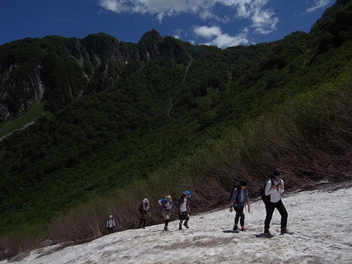 一方「らいちょうさんチーム」7名は、徳澤-涸沢を日帰り往復する約10時間のロングトレイル。雪渓の上を進んで、涸沢を目指しました